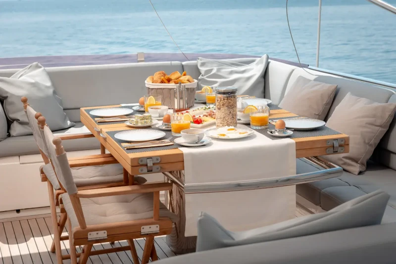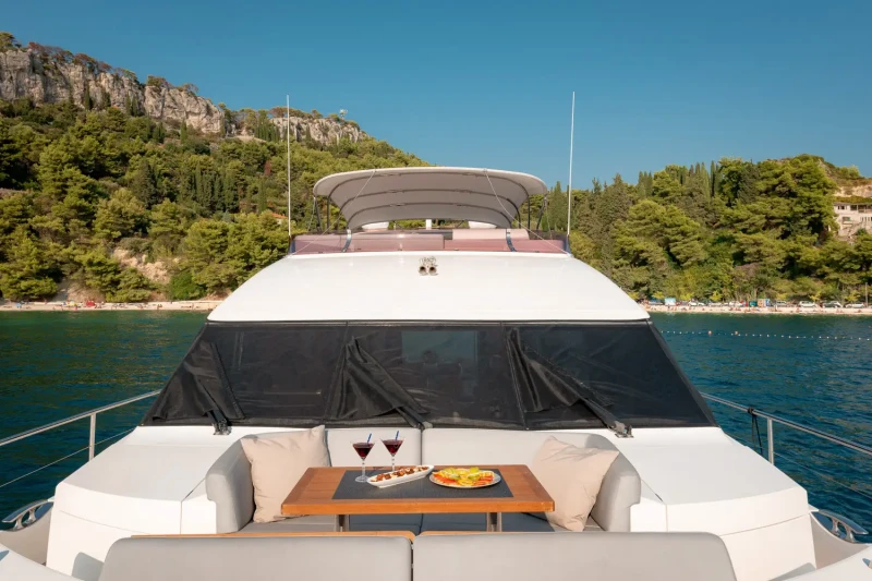 Step aboard the Princess 72 and indulge in a world of luxury and sophistication. From the breathtaking panoramic views in the living area to the cozy comfort of the sleeping quarters, every detail of this yacht exudes elegance. Impeccably maintained, the highlight of the Princess 72 is its stunning flybridge, complete with a grill, bar, and dining area under a sun-protective bimini. Accommodating up to eight guests, the yacht offers three double cabins and one twin cabin, all equipped with air conditioning and LCD TVs for ultimate comfort. With a dedicated crew of two, your safety and enjoyment are paramount as you embark on an unforgettable journey exploring the stunning beauty of Croatia's coastline.